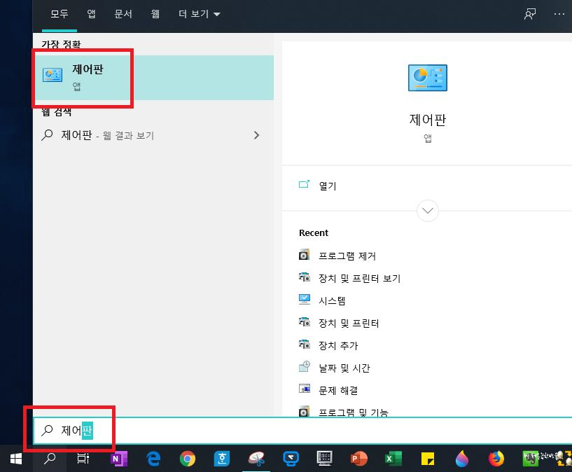 제어판이라 입력한 후 위에 나타난 제어판을 실행하거나